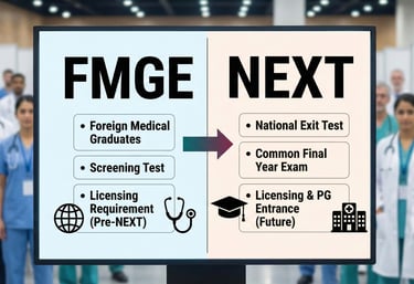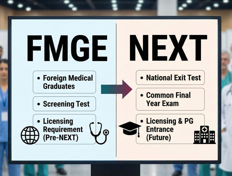 Currently, students take the FMGE. However, this is transitioning to NExT (National Exit Test), which will be common for both Indian and Foreign graduates.